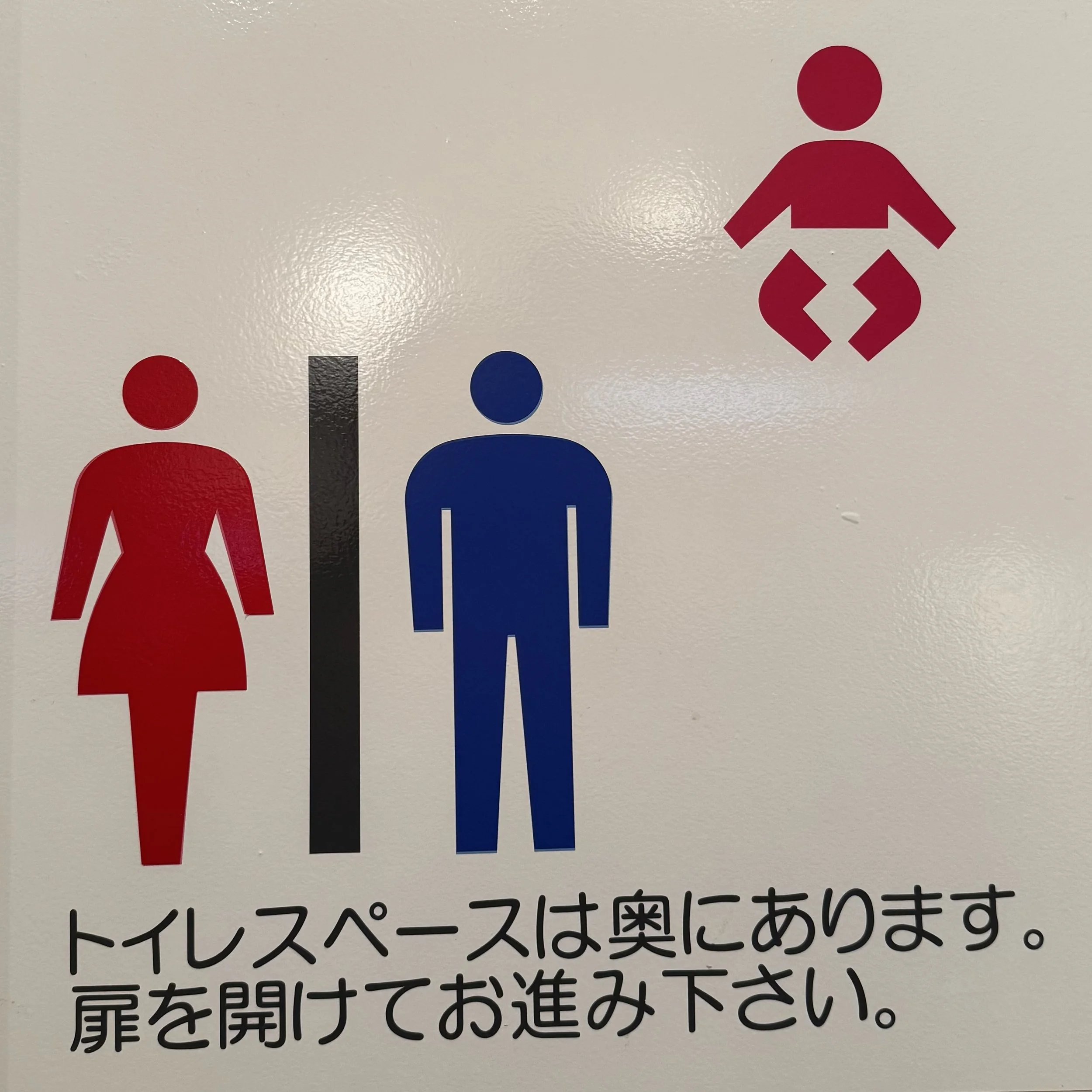 Wash room signage is absolutely uniform throughout Japan. The lady is always red and the gent is always blue.