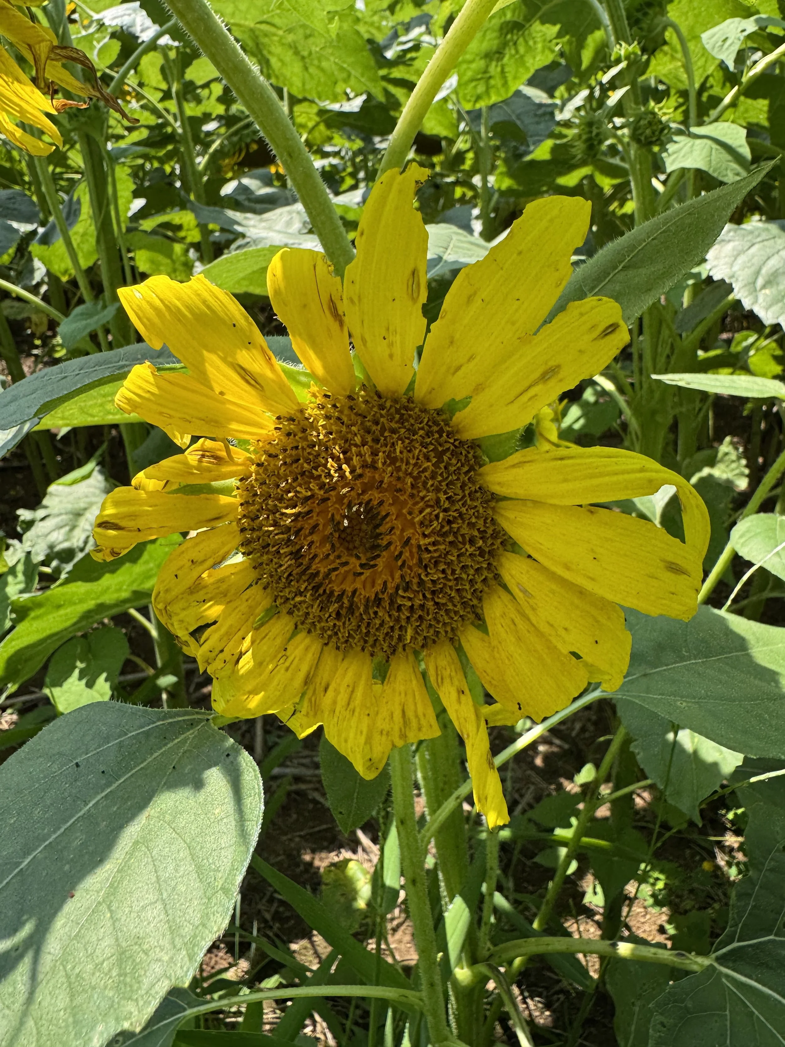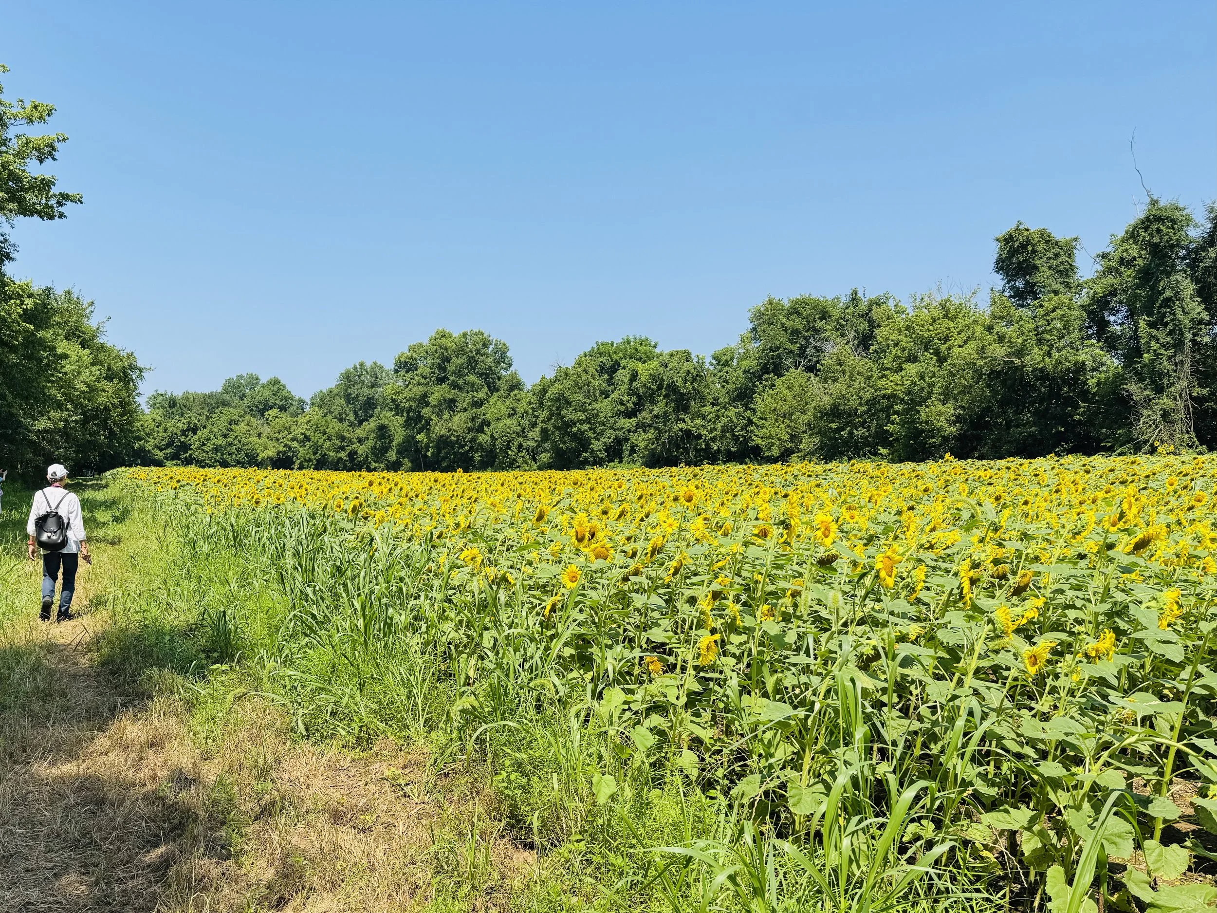 Then we saw them. The field of sunflowers nearly 500 meters long and perhaps 200 meters wide. That’s when we realized that we were a week or two late. The sunflowers were still in full bloom but fraying at the edges, a bit bedraggled in the hot summer air, no longer at their peak.
